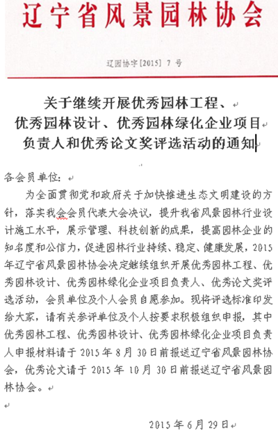 本次征集评选活动,辽宁省风景园林协会向入选论文颁发获奖证书,择优推荐在国内公开发行的期刊上发表。