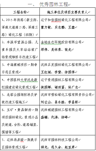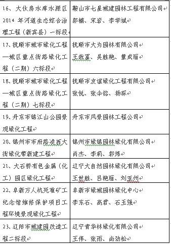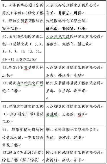 根据辽宁省风景园林协会《关于继续开展省优秀园林设计、优秀园林工程、优秀园林管理评选活动的通知》和《关于继续开展优秀会员单位和优秀协会工作者评选活动的通知》文件的要求,经自愿申报、择优推荐、专家评审、现场考察、网站公示、会长办公会议研究、报省业务指导部门同意,省风景园林协会决定表彰大连联华公园(东联路交中华路口)绿化工程等23项工程为优秀园林工程;中国药科大学沈北新校园建设景观设计等9项设计为优秀园林设计;抚顺市风景园林古建筑工程公司等17个单位为优秀管理奖;锦州市市政园林行业协会等18个单位为优秀会员单位;寇有良等13名同志为优秀协会工作者。希望获得荣誉的集体和个人再接再厉,为推进辽宁园林事业发展再立新功!