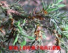 近期,我市桧柏 上的锈病冬孢 子角遇雨膨胀,陆续释放出孢子,随空气向转寄主植物——苹果、梨、山楂等植物上转移、侵染。此时,应对桧柏、苹果、梨、山楂等植物喷药预防,用药可选 25%三唑酮可湿性粉剂 800 倍液、30%氟菌唑可湿性粉剂 1500 倍液、12.5%腈菌唑乳油 1500 倍桧柏上的冬孢子角雨后膨胀 。