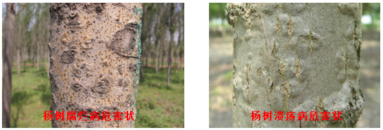 腐烂病的病原是可潜伏侵染多年的弱寄生性病原菌,比较容易在生长势较弱的植株上发生危害,一旦秋冬气候条件不利于其安全越冬,极易爆发流行,此类病害一般与生理性病害相伴发生。杨、柳、榆、国槐、臭椿等多种常见园林植物均可发病,通常情况下与溃疡病同时发生。防治此类病害,要从增强植株生长势角度多下功夫,如植物越冬休眠前后浇灌封冻水和返青水、冬季防寒、及时拔除更换重病株等。
