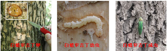 近年来危害我市白蜡的重要蛀干害虫,幼虫潜伏于树干韧皮部和木质部中间串食危害,危害症状极难识别,成虫期集中在5-6月。一旦疏于防治,可致树木死亡。