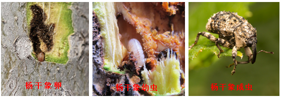 杨干象是危害杨树的重要蛀干害虫,主要危害幼龄杨树枝干、杨树3-4年生枝条,以幼虫在韧皮部和木质部之间环绕蛀食危害,成虫期在5-7月。防治不及时,种群密度会增长很快。严重发生时,枝干易遭风折而亡。