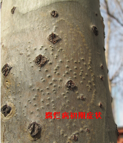 【溃疡病】 在我市以杨树溃疡病为主。受害部位树皮上出现近圆形水渍状和水泡状病斑,严重时流出褐色液体,之后病斑下陷病斑内部坏死范围扩大,当病斑在皮下连接包围树干时,上部枯死。