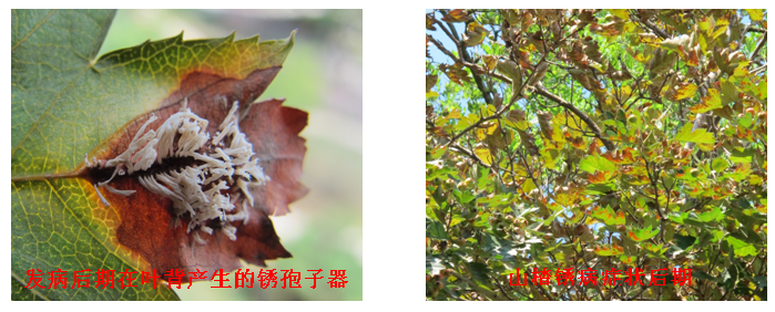 锈病是危害我市蔷薇科园林植物的主要叶部病害。夏季,受害植株几乎全株叶片布满病斑,受害叶片失水、变褐、脱落,严重影响园林植物的生长和景观效果。在我市苹果、海棠、梨、山楂等蔷薇科植物上发生较为严重。此类锈病为转主寄生病害,其转主寄主主要是柏科的桧柏,故称为苹-桧锈病、梨-桧锈病、山楂-桧锈病。