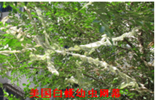 防治方法:⑴ 向受害寄主植物喷施1.2%苦•烟乳油800倍液或阿维•高氯2000~2500倍液,防治幼虫;⑵ 对美国白蛾喜食寄主植物加强巡视、监测,发现网幕及时剪除并销毁处理。