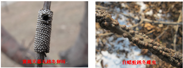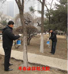 结合春季修剪,清理带有病虫的枝条以及枯死株。同时,针对一些主要病虫害,依据其越冬习性进行人工防治,例如:去除黄褐天幕毛虫卵环(京桃、榆叶梅等枝条上)、舞毒蛾卵块(杨、柳等枝干下方)、美国白蛾蛹(杨、白蜡、臭椿、榆等寄主植物地表覆盖物或周围廊檐下方、诱蛹稻草等)、白蜡蚧雌虫(白蜡、水蜡枝条)等。