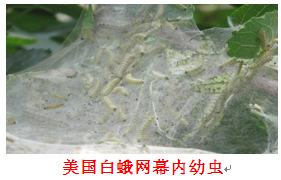 防治方法:①继续巡视辖区内的街路、绿地,特别是一些平时疏于管理的点位,发现网幕立即剪除,或者喷洒1.2%烟参碱乳油800倍液灭杀幼虫。②向美国白蛾喜食寄主植物(复叶槭、臭椿、榆、杨、桑、柳等)喷施25%灭幼尿悬浮剂3000倍液或3%苯氧威乳油3000倍液等药剂进行全面预防。兼顾防治国槐尺蠖、槐羽舟蛾(国槐、刺槐)及粘虫(草坪)等其它食叶类害虫。