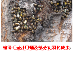 【榆绿毛荧叶甲】据监测,目前已在榆树枝杈的背阴处集中化蛹,小部分陆续羽化为成虫,即将进入羽化盛期,目前正是趁其集中化蛹大量灭杀榆绿毛萤叶甲的有利时机。向化蛹处喷洒2.5%溴氰菊酯乳油2000倍液或人工清除虫蛹进行防治。