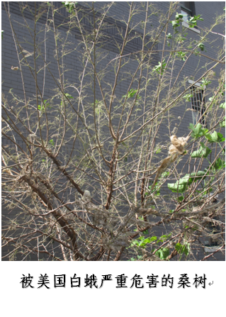 防治方法:①防治网幕幼虫:人工剪除网幕,集中销毁,并向受害株喷施1.2%苦•烟乳油800倍液或阿维•高氯2000~2500倍液进行彻底防治;②防治老熟幼虫:在美国白蛾老熟幼虫发生期,可于高大乔木主干基部,涂抹粘虫胶阻截防治下树准备化蛹越冬的幼虫,兼治其它爬行下树越冬类害虫,或者在主干基部绑草诱蛹。