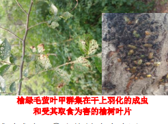 4、做好榆绿毛萤叶甲、美国白蛾、棕色瓢跳甲等食叶类害虫的防治工作