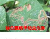 【棕色瓢跳甲】为害我省丁香,以幼虫潜入叶片皮下危害,会在叶表皮下钻出弯曲虫道,其成虫也会造成叶表出现不规则刻痕,削弱光合作用,严重发生会使大量叶片枯焦且影响绿地景观效果。