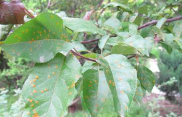 苹果(梨、山楂)锈病在我省近年发生较重。随着春季海棠、苹果、梨、山楂等蔷薇科植物的展叶,此类病害的病原菌开始由越冬寄主——桧柏向上述蔷薇科植物扩散转移。初期病原菌处在潜育期,外观难以发现,待到受害植株叶片产生黄色病斑、甚至叶背出现性孢子器等明显症状时,便已错过预防时期,防治工作很难取得效果。